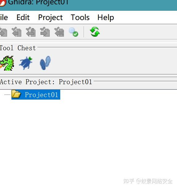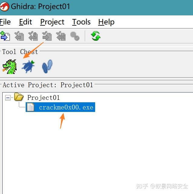 接下来,会显示你的项目和导入的文件。你可以双击文件或将文件拖到上面的绿色Ghidra龙图标上开始进行分析。