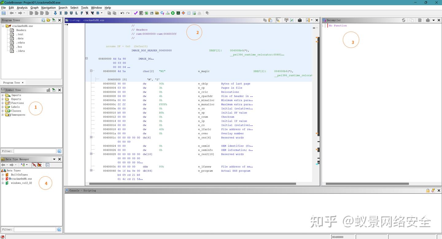 Ghidra将分析你的文件,并显示类似于下面四个窗口的信息。