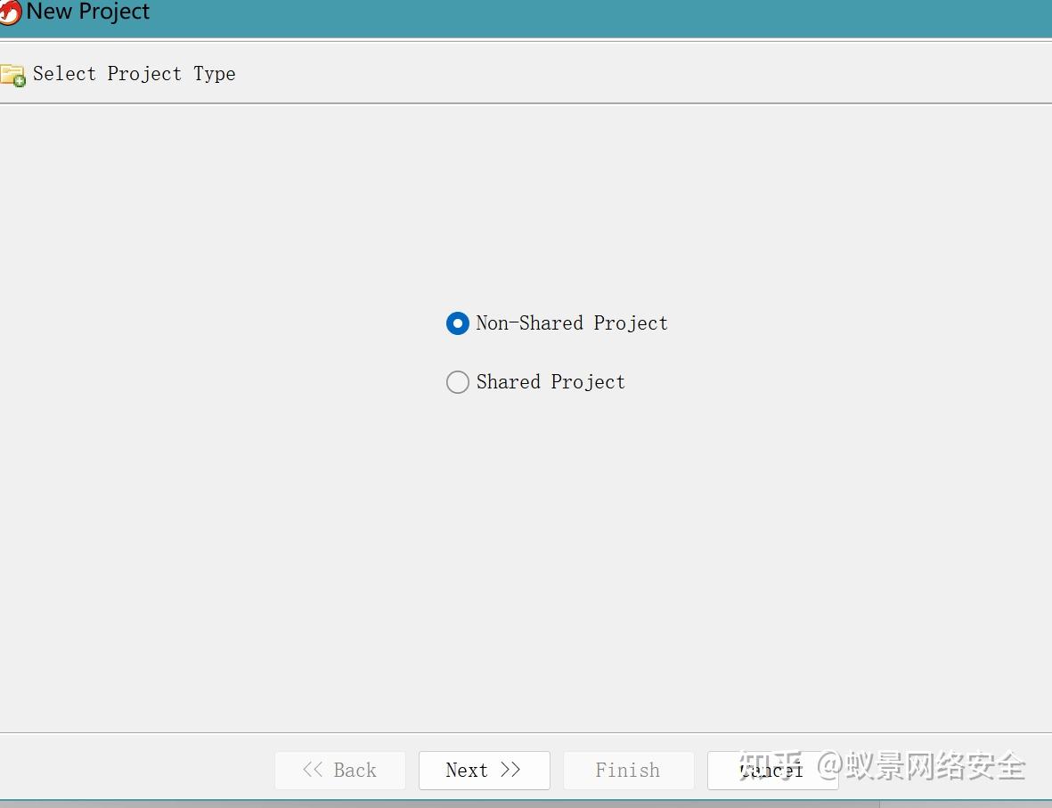 这将打开一个像下面这样的窗口。Ghidra的一个特点是能够在一个文件或项目上进行协作。在这种情况下,点击 "Shared Project"。在这里,我们不需要共享,所以选择 "No-Shared Project"。然后点击 "Next"。