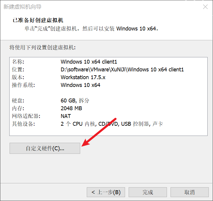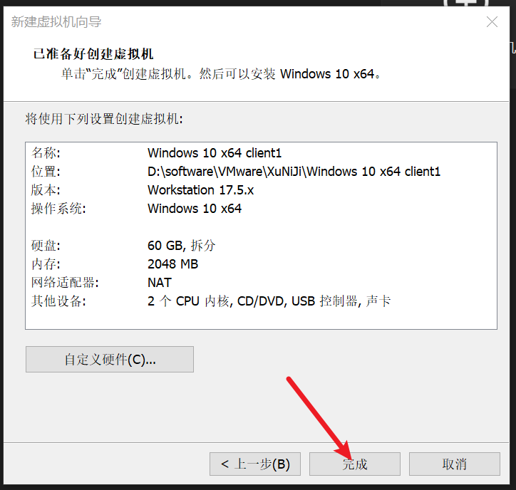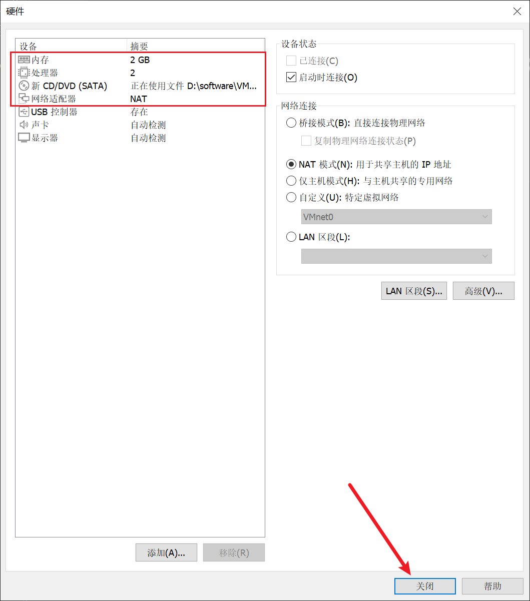我这里内存给了2GB,处理器给了俩,网络适配器是默认的NAT模式,请根据你自己的需求来配置,配置完后点击