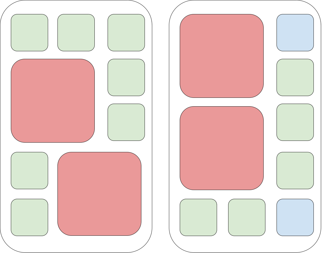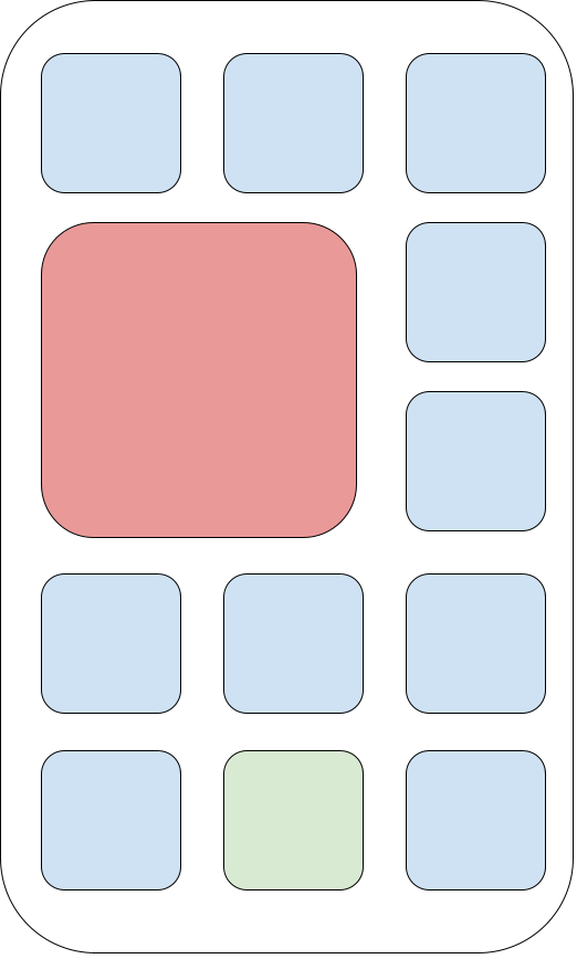 Blue squares represent empty spaces for icons, green squares represent $ 1 \times 1 $ icons, red squares represent $ 2 \times 2 $ iconsThe solution for the third test case can look as follows: