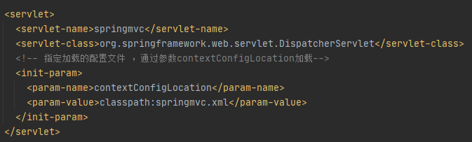 <param-init>:变量的值为 classpath:springmvc.xml 是 springMVC 配置文件所在路径