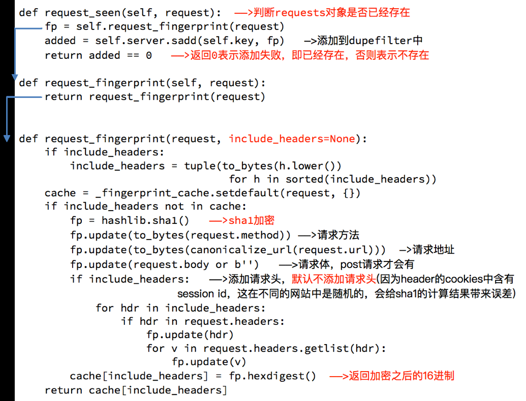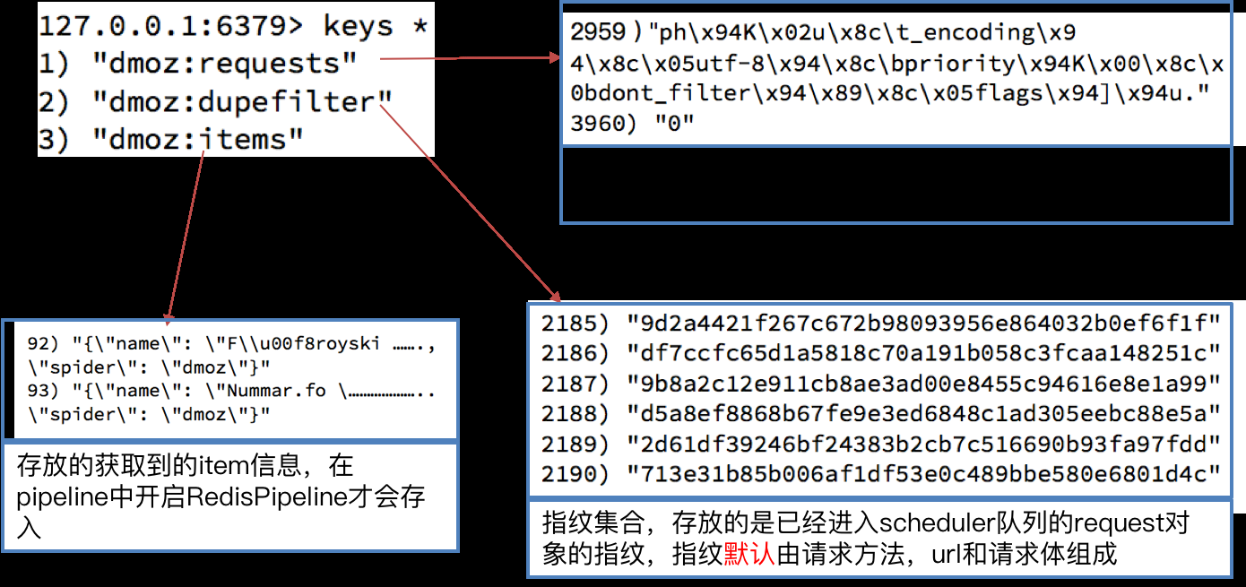 所有的request对象存入redis前,都会通过该redis中的request指纹集合进行判断,之前是否已经存入过