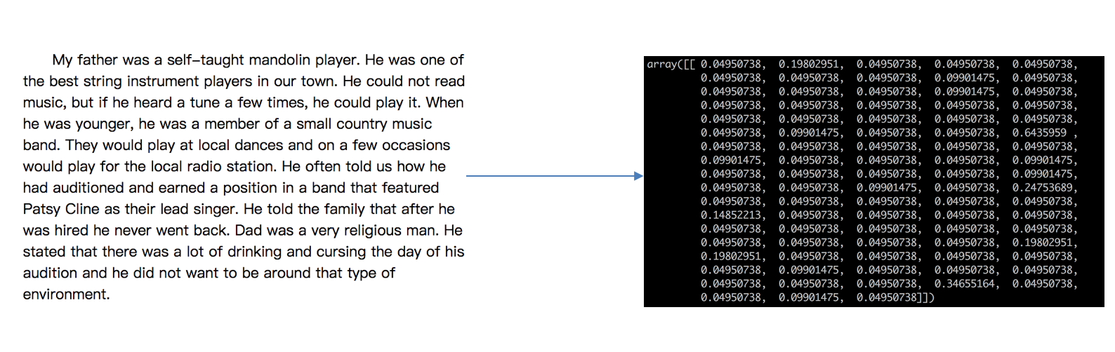 Building prefix dict from the default dictionary ... Loading model from cache /var/folders/mz/tzf2l3sx4rgg6qpglfb035_r0000gn/T/jieba.cache Loading model cost 0.856 seconds. Prefix dict has been built succesfully. ['一种 还是 一种 今天 很 残酷 , 明天 更 残酷 , 后天 很 美好 , 但 绝对 大部分 是 死 在 明天 晚上 , 所以 每个 人 不要 放弃 今天 。', '我们 看到 的 从 很 远 星系 来 的 光是在 几百万年 之前 发出 的 , 这样 当 我们 看到 宇宙 时 , 我们 是 在 看 它 的 过去 。', '如果 只用 一种 方式 了解 某样 事物 , 你 就 不会 真正 了解 它 。 了解 事物 真正 含义 的 秘密 取决于 如何 将 其 与 我们 所 了解 的 事物 相 联系 。'] 文本特征抽取的结果: [[ 0. 0. 0. 0.43643578 0. 0. 0. 0. 0. 0.21821789 0. 0.21821789 0. 0. 0. 0. 0.21821789 0.21821789 0. 0.43643578 0. 0.21821789 0. 0.43643578 0.21821789 0. 0. 0. 0.21821789 0.21821789 0. 0. 0.21821789 0. ] [ 0.2410822 0. 0. 0. 0.2410822 0.2410822 0.2410822 0. 0. 0. 0. 0. 0. 0. 0.2410822 0.55004769 0. 0. 0. 0. 0.2410822 0. 0. 0. 0. 0.48216441 0. 0. 0. 0. 0. 0.2410822 0. 0.2410822 ] [ 0. 0.644003 0.48300225 0. 0. 0. 0. 0.16100075 0.16100075 0. 0.16100075 0. 0.16100075 0.16100075 0. 0.12244522 0. 0. 0.16100075 0. 0. 0. 0.16100075 0. 0. 0. 0.3220015 0.16100075 0. 0. 0.16100075 0. 0. 0. ]] 返回特征名字: ['之前', '了解', '事物', '今天', '光是在', '几百万年', '发出', '取决于', '只用', '后天', '含义', '大部分', '如何', '如果', '宇宙', '我们', '所以', '放弃', '方式', '明天', '星系', '晚上', '某样', '残酷', '每个', '看到', '真正', '秘密', '绝对', '美好', '联系', '过去', '还是', '这样']