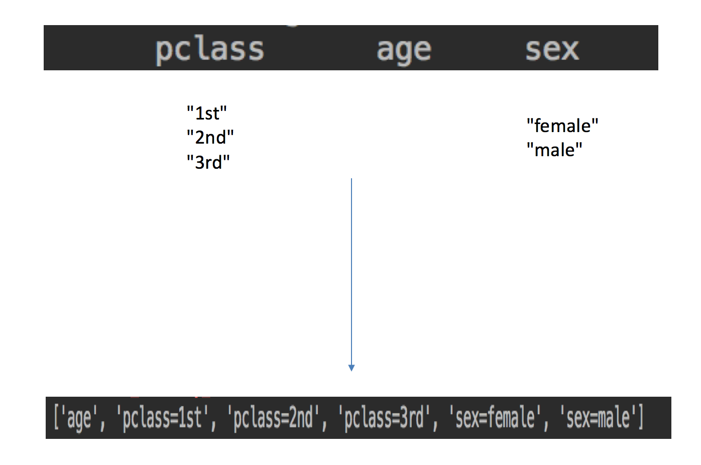 返回的结果: [[ 0. 1. 0. 100.] [ 1. 0. 0. 60.] [ 0. 0. 1. 30.]] 特征名字: ['city=上海', 'city=北京', 'city=深圳', 'temperature']