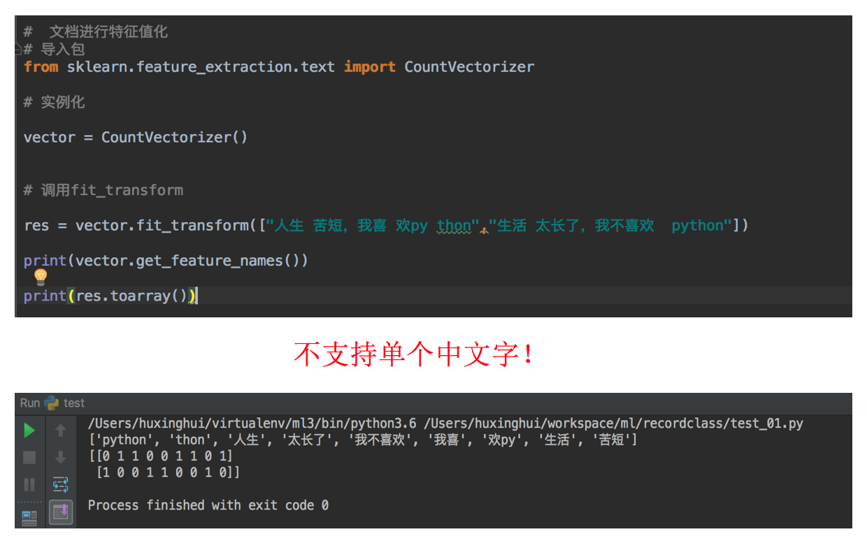 from sklearn.feature_extraction.text import CountVectorizer def text_count_demo(): """ 对文本进行特征抽取,countvetorizer :return: None """ data = ["life is short,i like like python", "life is too long,i dislike python"] # 1、实例化一个转换器类 # transfer = CountVectorizer(sparse=False) # 注意,没有sparse这个参数 transfer = CountVectorizer() # 2、调用fit_transform data = transfer.fit_transform(data) print("文本特征抽取的结果:\n", data.toarray()) print("返回特征名字:\n", transfer.get_feature_names()) return None