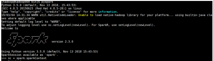 [hadoop@hadoop000 ~]$ pyspark Python 3.5.0 (default, Nov 13 2018, 15:43:53) [GCC 4.8.5 20150623 (Red Hat 4.8.5-28)] on linux Type "help", "copyright", "credits" or "license" for more information. 19/03/08 12:19:55 WARN util.NativeCodeLoader: Unable to load native-hadoop library for your platform... using builtin-java classes where applicable Setting default log level to "WARN". To adjust logging level use sc.setLogLevel(newLevel). For SparkR, use setLogLevel(newLevel). Welcome to ____ __ / __/__ ___ _____/ /__ _\ \/ _ \/ _ `/ __/ '_/ /__ / .__/\_,_/_/ /_/\_\ version 2.3.0 /_/ Using Python version 3.5.0 (default, Nov 13 2018 15:43:53) SparkSession available as 'spark'. >>> sc <SparkContext master=local[*] appName=PySparkShell>