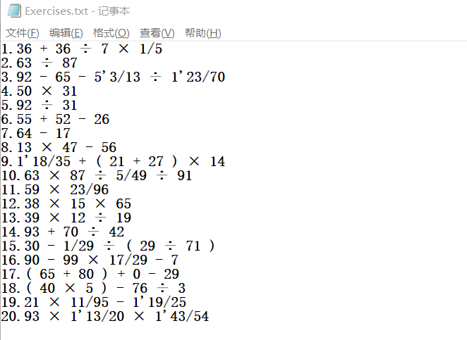 - 生成的题目存入执行程序的当前目录下的Exercises.txt文件。(完成)