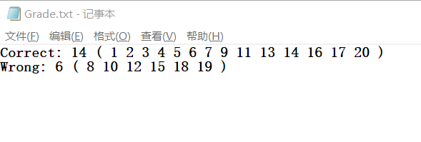 1 import java.io.BufferedReader; 2 import java.io.FileReader; 3 import java.io.PrintStream; 4 5 public class Grade { 6 int n; 7 public Grade(int _n){ 8 n=_n; 9 } 10 void Count()throws Exception { 11 BufferedReader br_a = new BufferedReader(new FileReader(".\\src\\Answer.txt")); 12 BufferedReader br_a1 = new BufferedReader(new FileReader(".\\src\\Answer1.txt")); 13 PrintStream grade = new PrintStream(".\\src\\" + "Grade.txt"); 14 int k = 0, count_c = 0, count_w = 0; 15 int[] corrt_wrong = new int[n]; 16 String s_a, s_a1; 17 while ((s_a = br_a.readLine()) != null && (s_a1 = br_a1.readLine()) != null && k < n) { 18 if (s_a.equals(s_a1)) { 19 corrt_wrong[k] = 0; 20 count_c++; 21 } else { 22 corrt_wrong[k] = 1; 23 count_w++; 24 } 25 k++; 26 } 27 grade.print("Correct:"+" "+count_c+" ( "); 28 for(int i=0;i<n;i++){ 29 if(corrt_wrong[i]==0) grade.print(i+1+" "); 30 } 31 grade.println(")"); 32 grade.print("Wrong:"+" "+count_w+" ( "); 33 for(int i=0;i<n;i++){ 34 if(corrt_wrong[i]==1) grade.print(i+1+" "); 35 } 36 grade.println(")"); 37 38 br_a.close(); 39 br_a1.close(); 40 grade.close(); 41 } 42 }