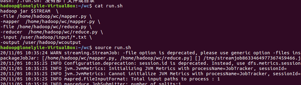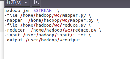 hadoop jar $STREAM \ -file /home/hadoop/baiyun/mapper.py \ -mapper /home/hadoop/baiyun/mapper.py \ -file /home/hadoop/baiyun/reduce.py \ -reducer /home/hadoop/baiyun/reduce.py \ -input /user/hadoop/input/qxdata.txt \ -output /user/hadoop/baiyunoutput