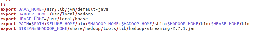 export JAVA_HOME=/usr/lib/jvm/default-java export HADOOP_HOME=/usr/local/hadoop export HBASE_HOME=/usr/local/hbase export PATH=$PATH:$FLUME_HOME/bin:$HADOOP_HOME:$HADOOP_HOME/sbin:$HADOOP_HOME/bin:$HBASE_HOME/bin export STREAM=$HADOOP_HOME/share/hadoop/tools/lib/hadoop-streaming-2.7.1.jar