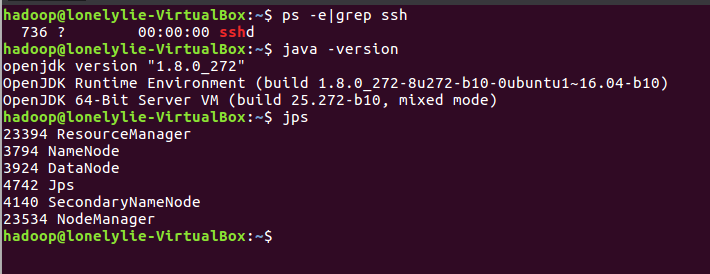 ps -e|grep ssh java -version start-dfs.sh jps