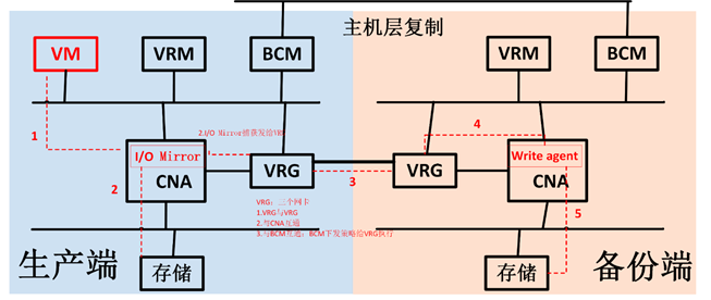 ①VM发起IO流,生产站点CNA收到后会进行IO双写,一份写入生产存储,一份通过I/O Mirror捕获发给本端VRG