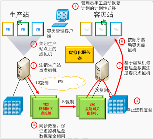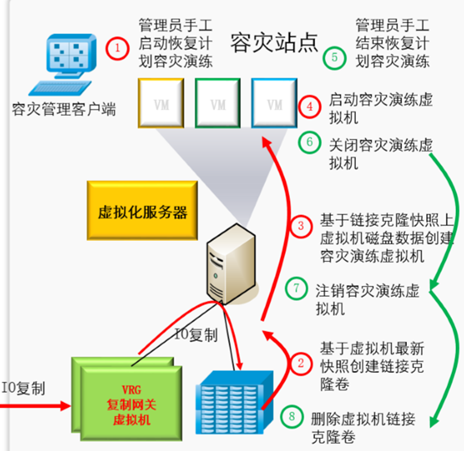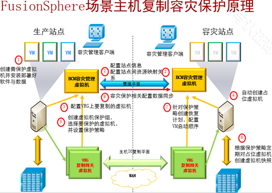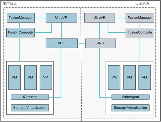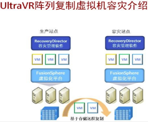主机复制容灾:利用主机的IO复制镜像功能(IO Mirror模块)和VRG虚拟复制网关,将生产站点上虚拟机的数据远程复制到容灾站点,实现容灾。