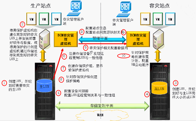 1、定义:左边为生产数据中心,右边为灾备数据中心,我们要将生产数据中心中的lun的数据灾备到灾备数据中心,通过BCM接入生产端存储、灾备端存储,通过创建保护集、保护策略、保护计划,待同步周期到来,将数据从后端存储链路传递至灾备端。