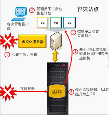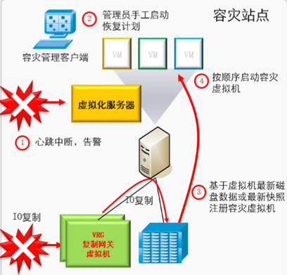 当灾难发生的时候,上层的BCManager发现生产端站点故障,它会将灾备端备份存储中的数据挂载给灾备端的灾备VM(灾备VM是一个空VM,只有灾难发生时才会拉活),完成业务拉起。