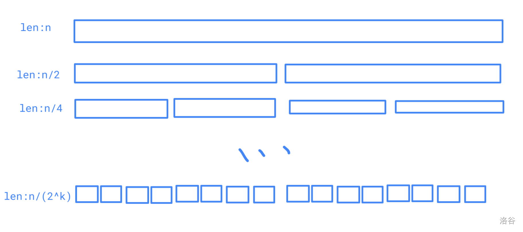每层的区间个数有一个性质:第 \(t\) 层 \(2^{t-1}\) 个,前 \(t\) 层一共 \(2^{t}-1\) 个。第 \(k\) 层的区间有 \(\mathcal{O}(\frac{n}{L})\) 个,由于前 \(k - 1\) 层的区间个数不超过第 \(k\) 层的区间个数,所以前 \(k\) 层的区间一共有 \(\mathcal{O}(\frac{n}{L})\) 个。