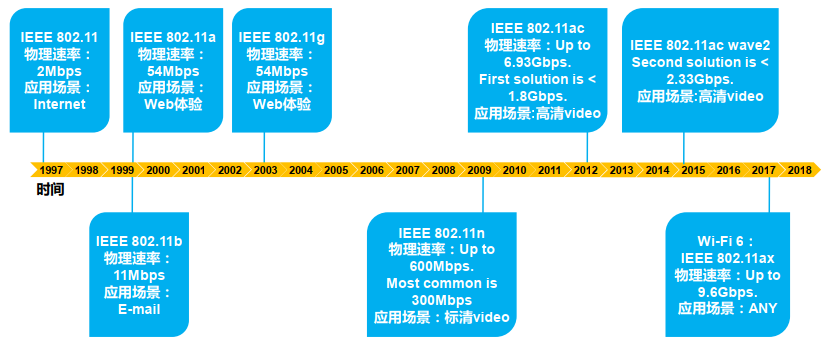 WIFI 主流的IEEE802.11无线标准,工作在2.4GHz或5GHz,11b支持最大速率为11Mbps、11a和11g支持最大速率为54Mbps、11n支持最大速率为300Mbps、11ax最高可达9Gbps