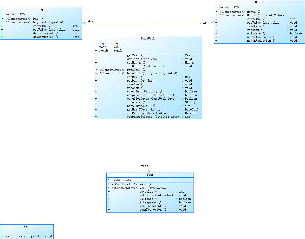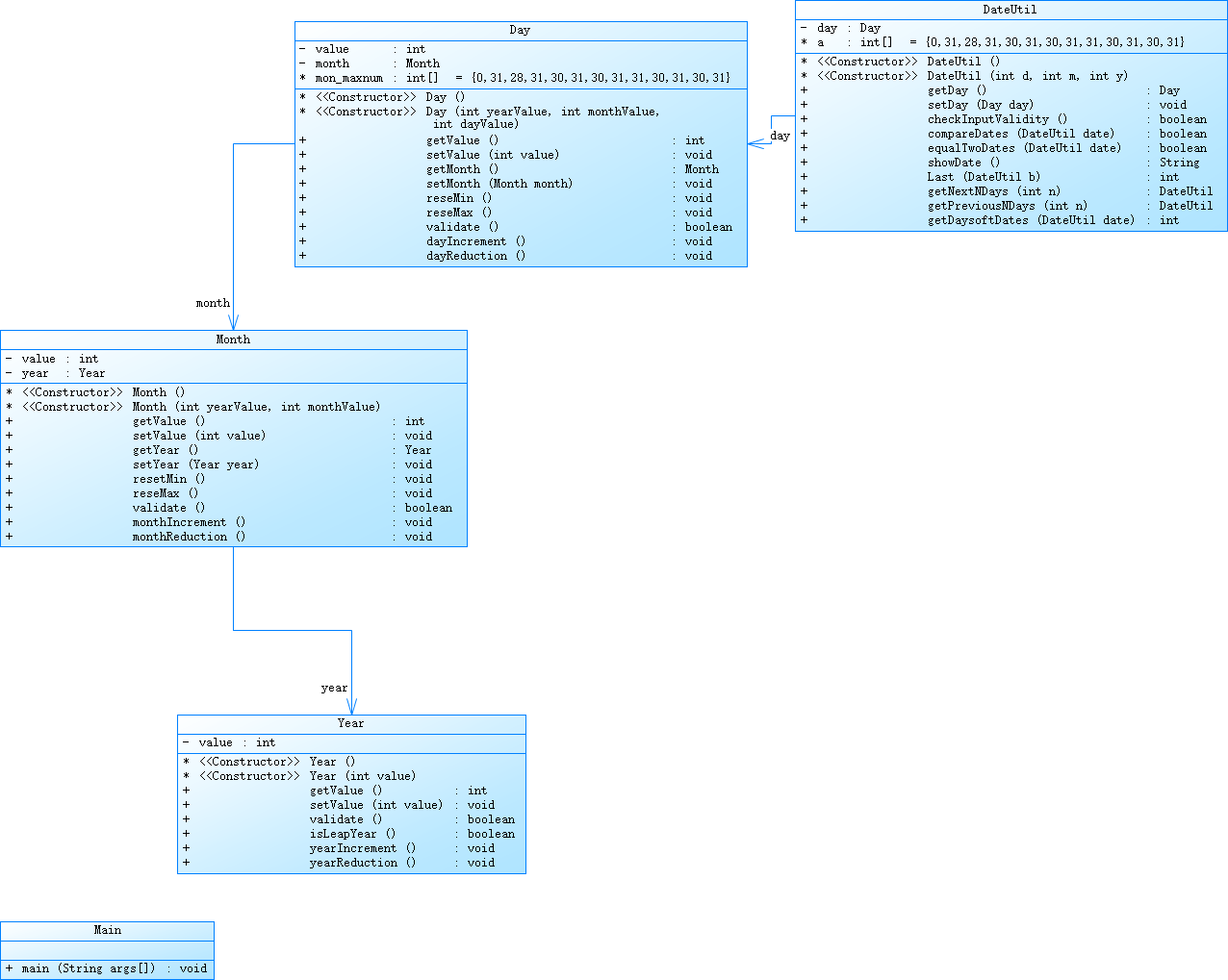参考题目7-3的要求,设计如下几个类:DateUtil、Year、Month、Day,其中年、月、日的取值范围依然为:year∈[1820,2020] ,month∈[1,12] ,day∈[1,31] , 设计类图如下: