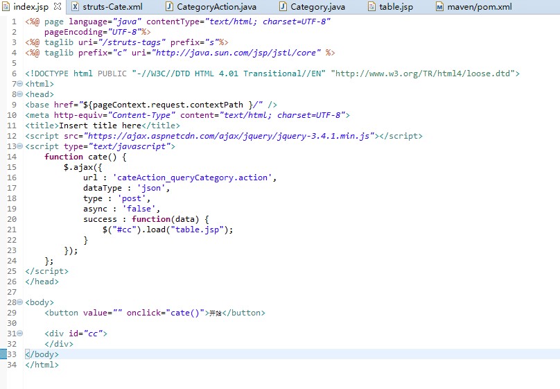 <script type="text/javascript"> function cate() { $.ajax({ url : 'cateAction_queryCategory.action',//查询数据路径 dataType : 'json', type : 'post', async : 'false', success : function(data) {//接收到值后刷新绑定数据的jsp页面 $("#cc").load("table.jsp");//cc是div的ID } }); };