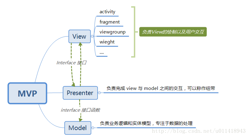 MVP把Activity中的UI逻辑抽象成View接口,把业务逻辑抽象成Presenter接口,Model类不变。总而言之,就是对外提供接口。