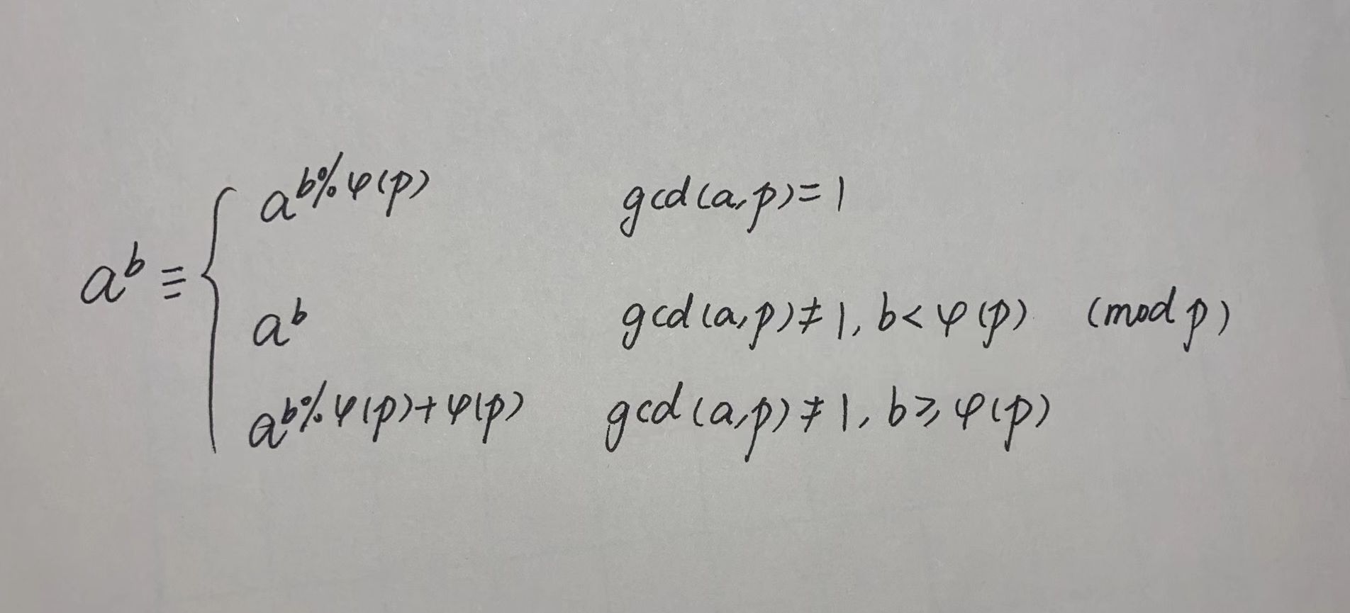 欧拉降幂公式为 \(a^bmod p = a\)^\((b mod φ( p )+φ( p )) mod p\)