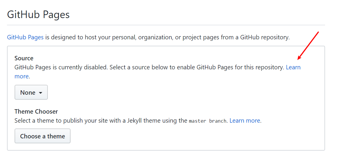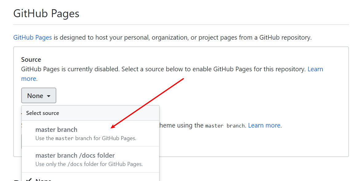 回到自己的仓库,进入 Settings,找到 GitHub Pages,点击 None,选择 master branch