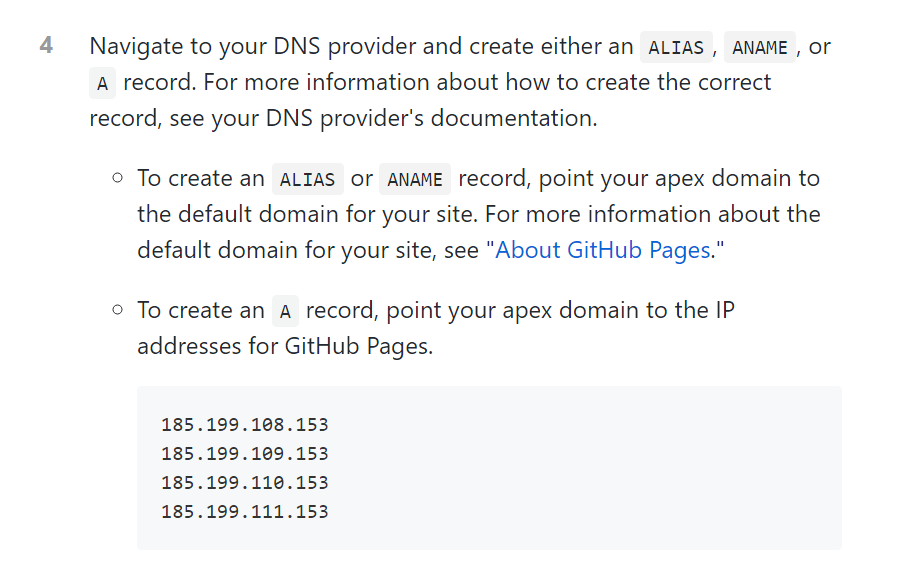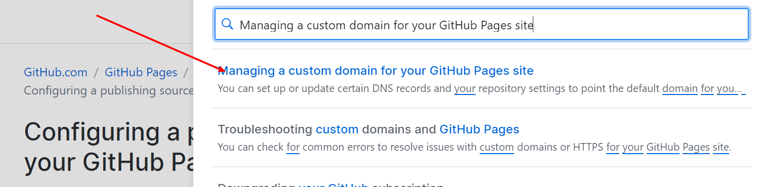 - 打开新网址后,在搜索框输入 Managing a custom domain for your GitHub Pages site ,点击第一个进入