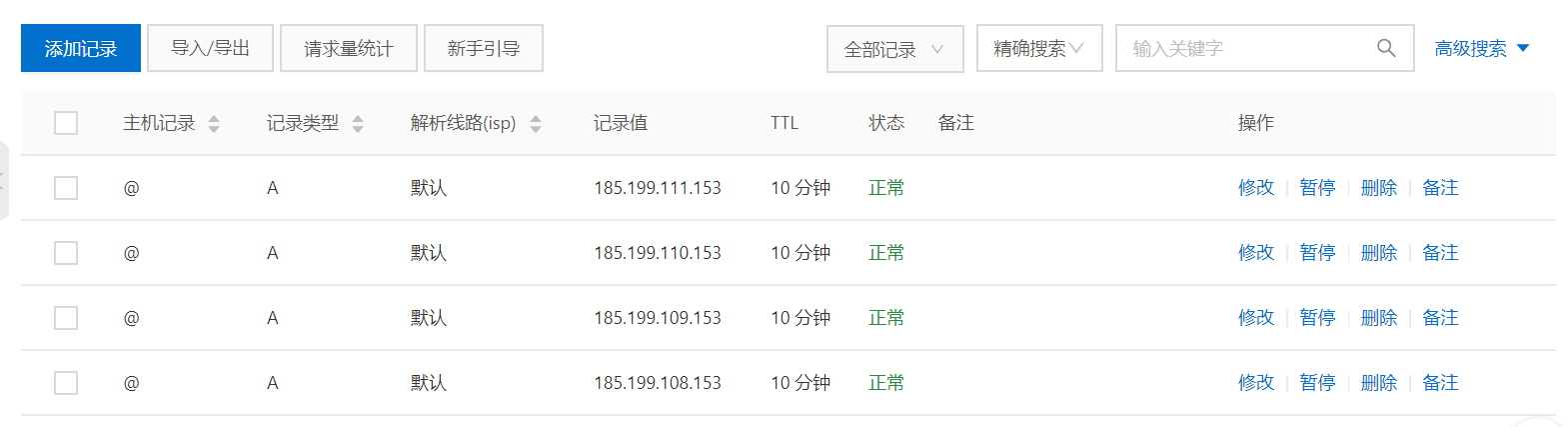 - 点击添加记录,记录类型选择 A-将域名指向一个IPV4地址,主机记录输入 @,记录值就复制刚才在github上那4行数字的第一行,点击确认即可。(需要添加四个记录,那4行数字每行都要添加一个记录),最后效果如下:
