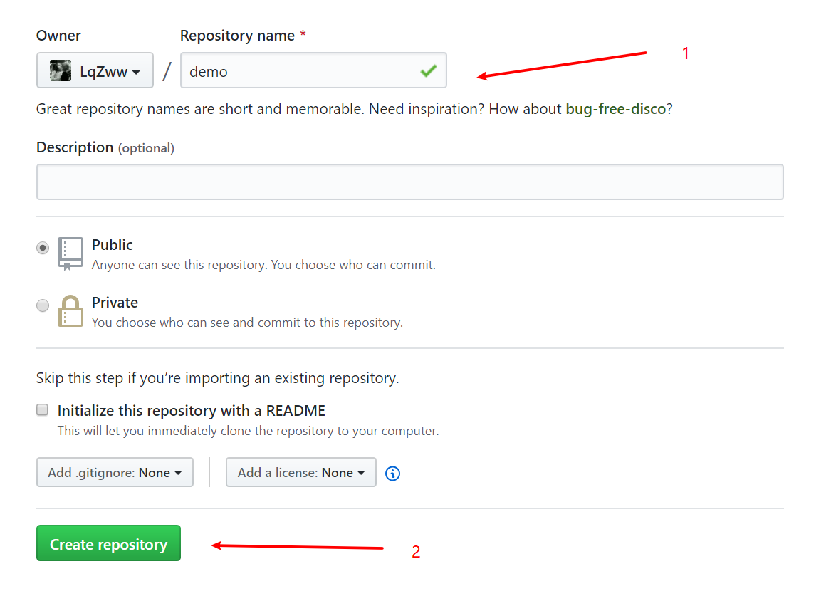 - 在Github上点击 New,Repository name 自己随便填写,填完这个后直接点 Create repository