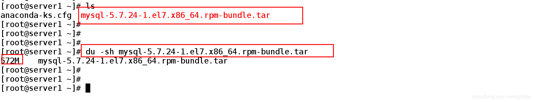[root@server1 ~]# du -sh mysql-5.7.24-1.el7.x86_64.rpm-bundle.tar ##查看压缩包容量的大小