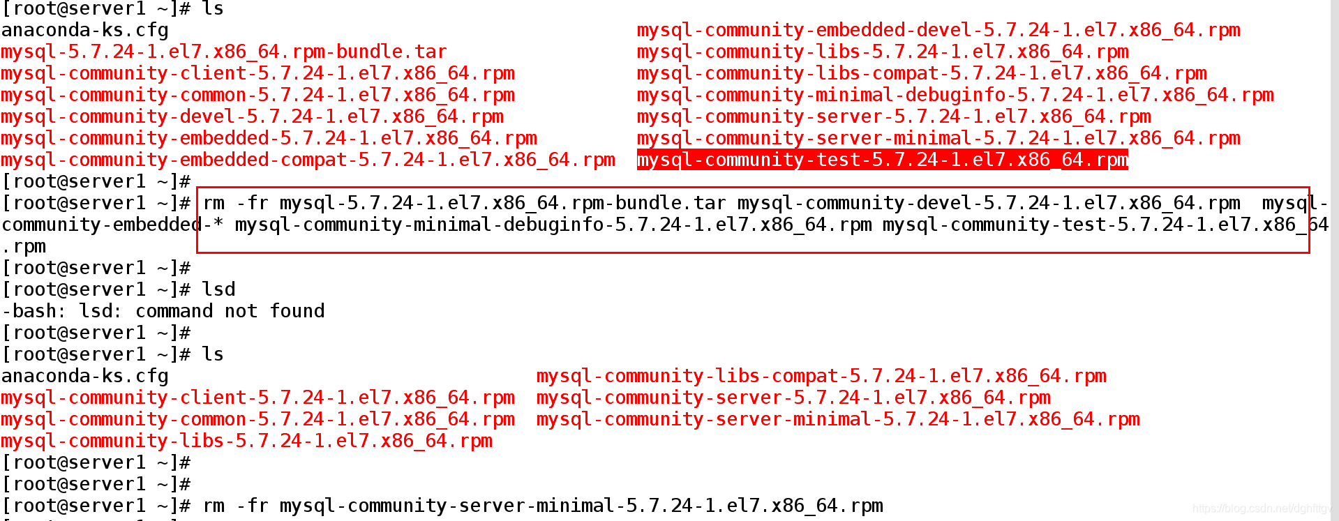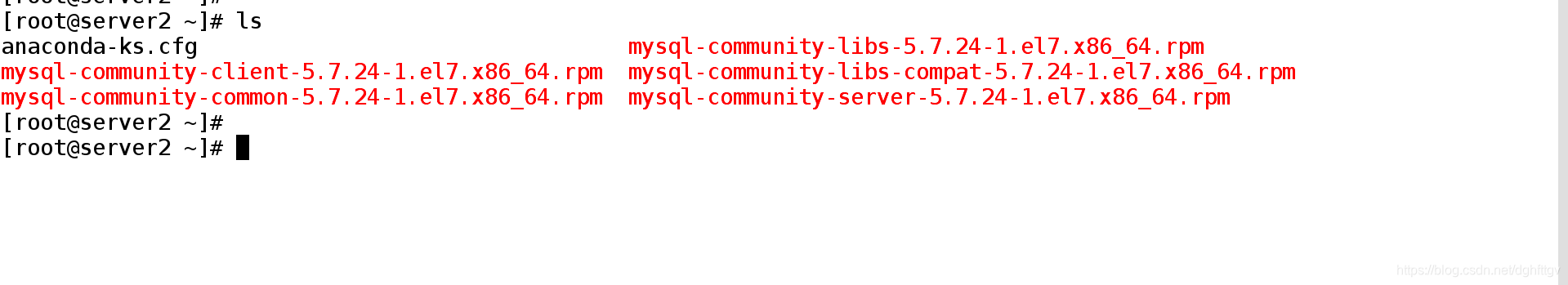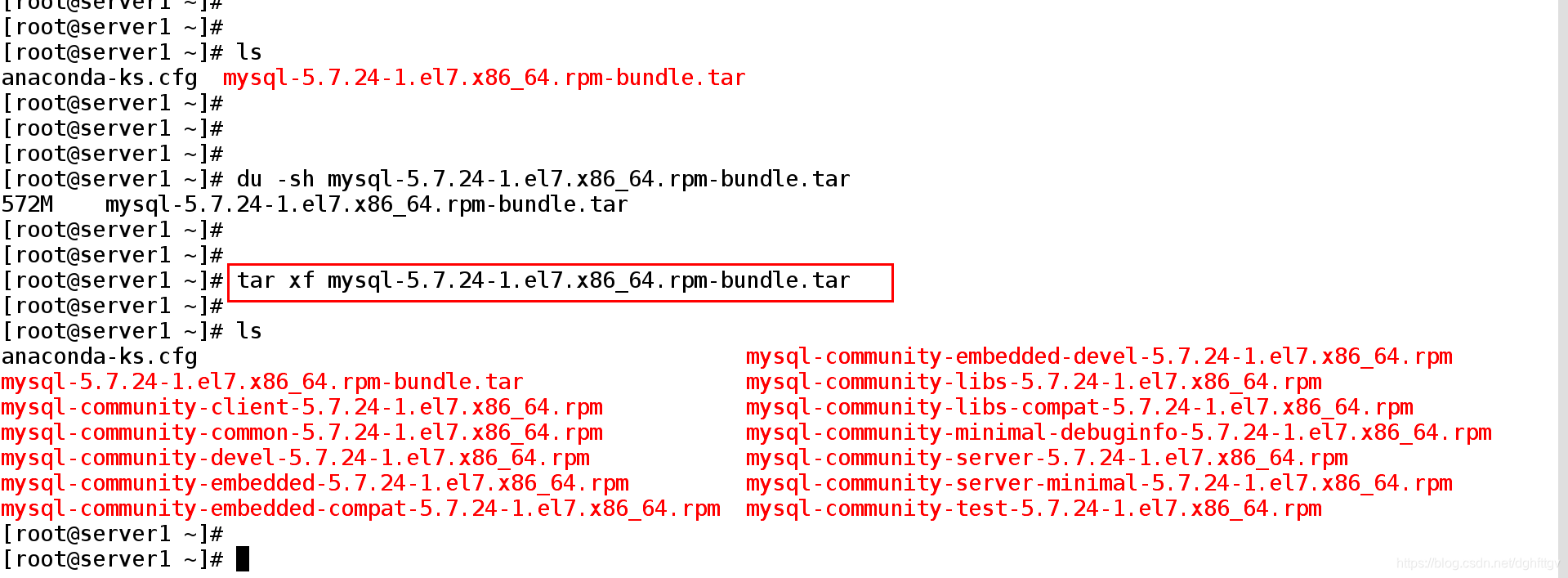 [root@server1 ~]# tar xf mysql-5.7.24-1.el7.x86_64.rpm-bundle.tar ##解压