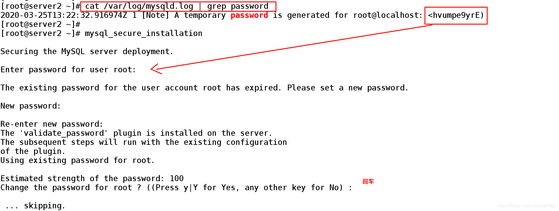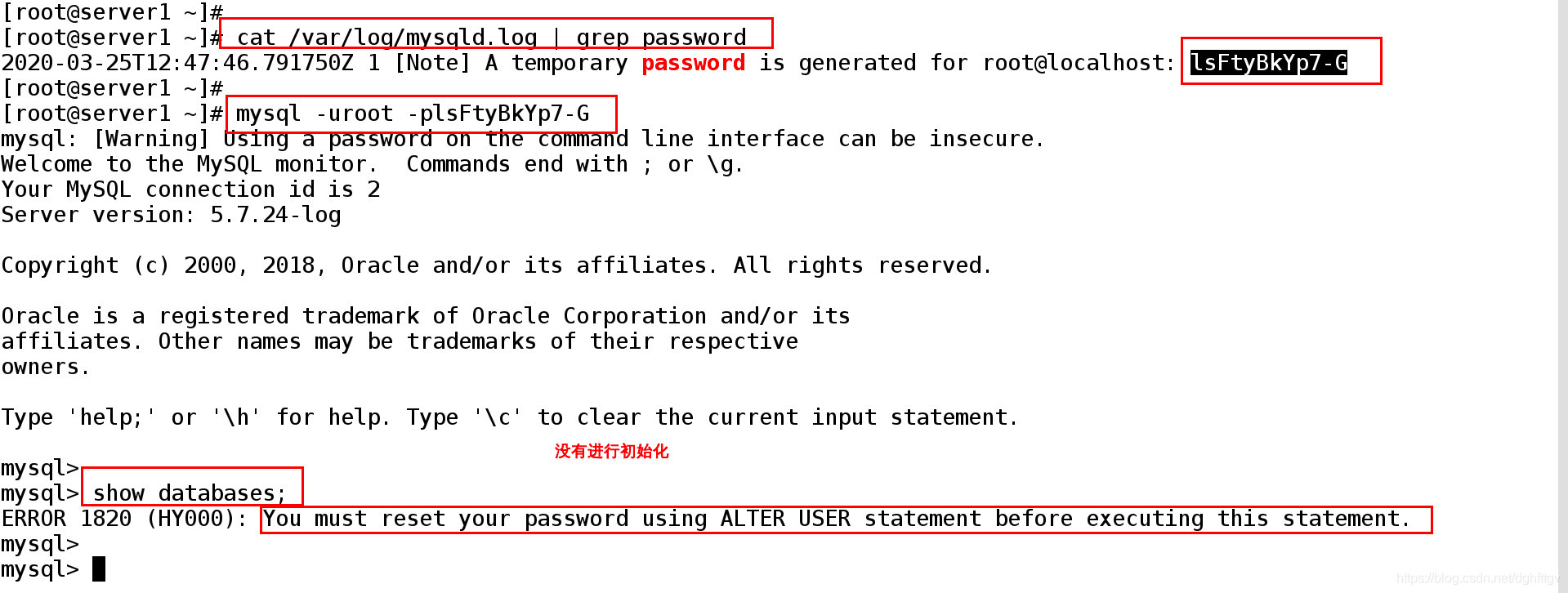开启服务之后会生成一个临时密码,使用临时密码进行数据库安全初始化