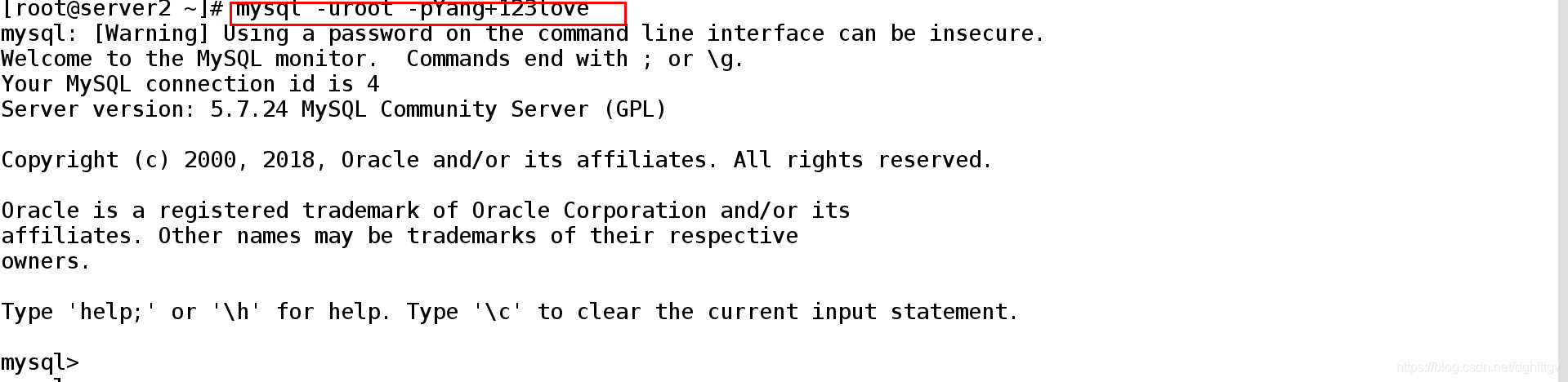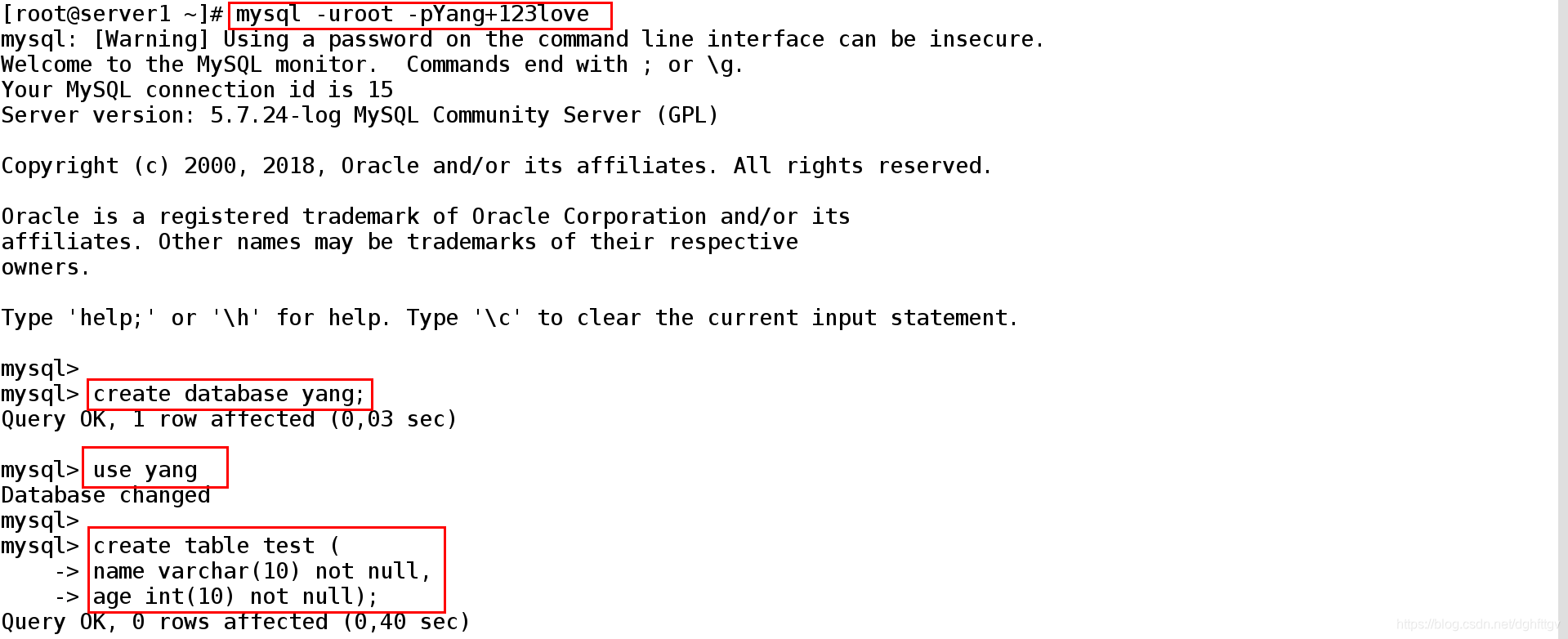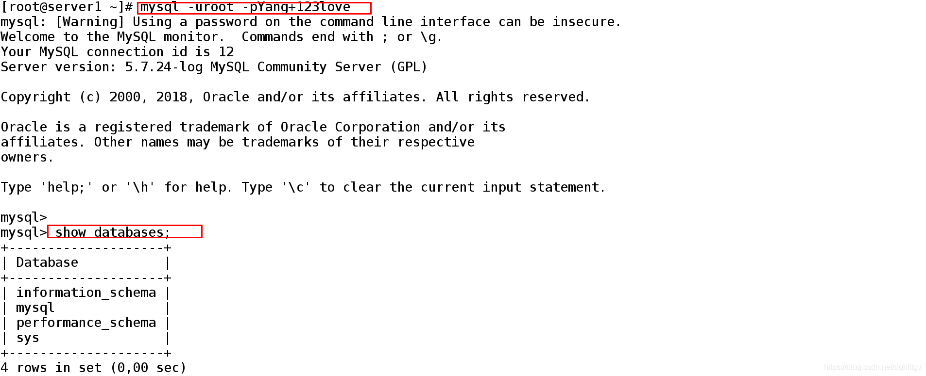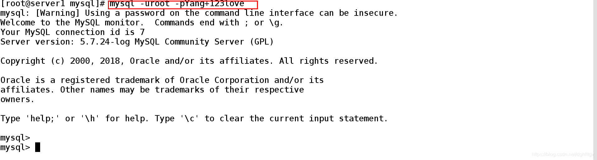 [root@server1 ~]# mysql -uroot -pYang+123love ##登录数据库