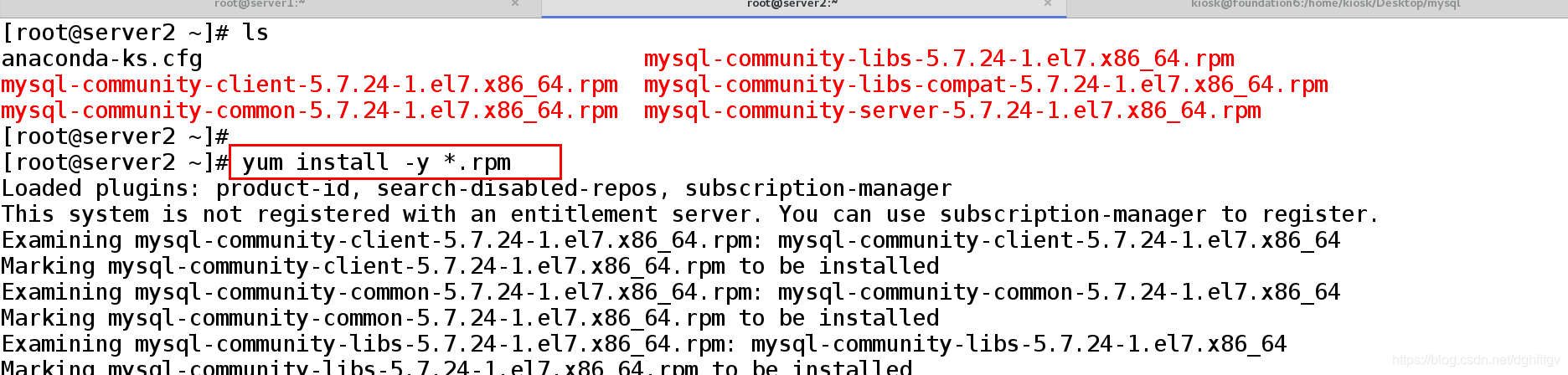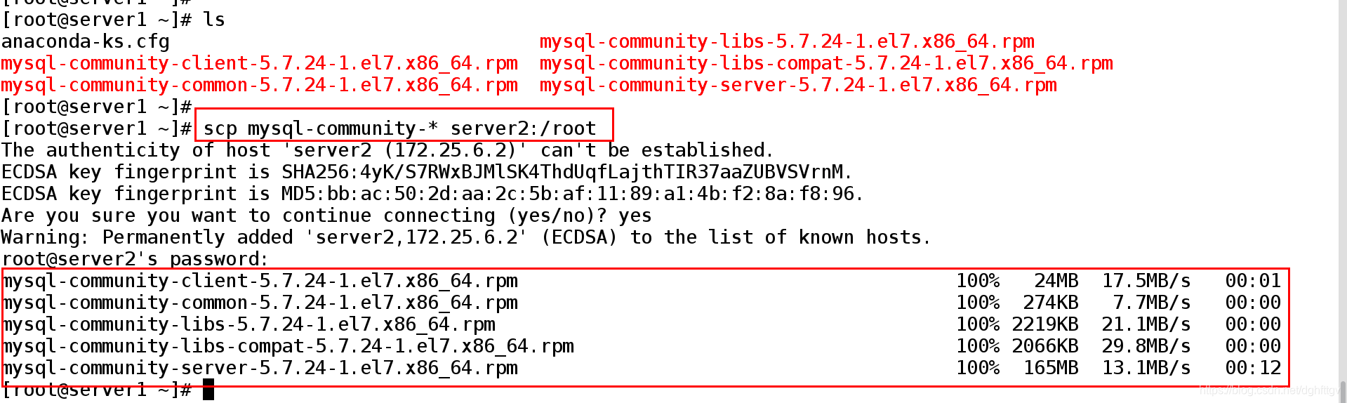 [root@server1 ~]# scp mysql-community-* server2:/root ##拷贝安装包