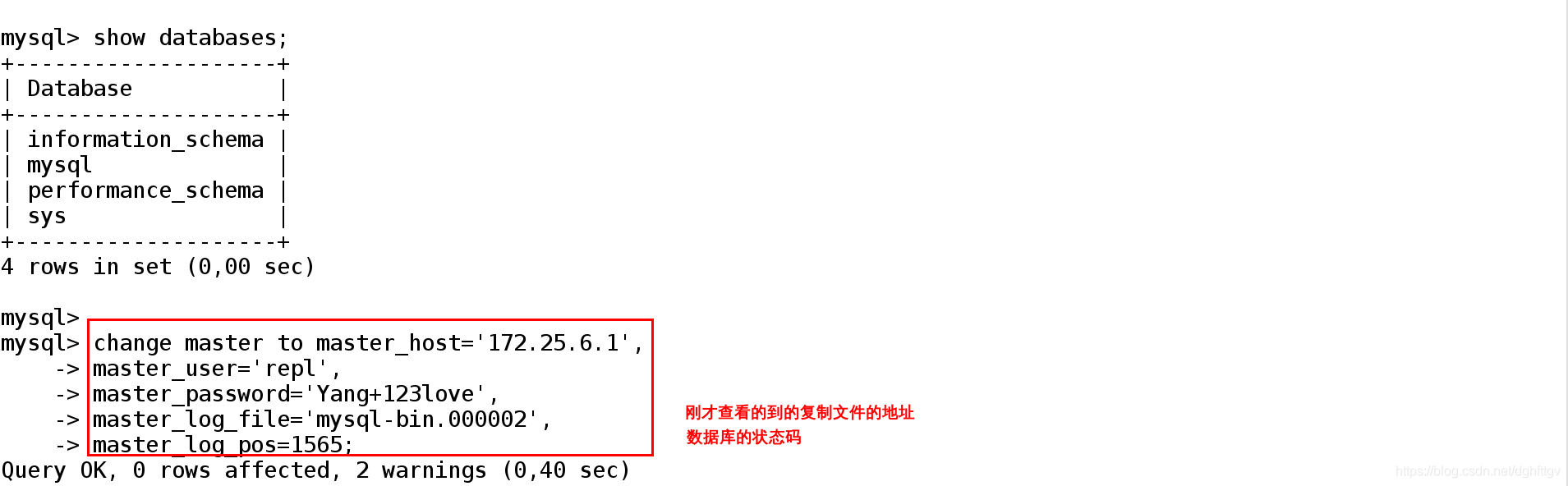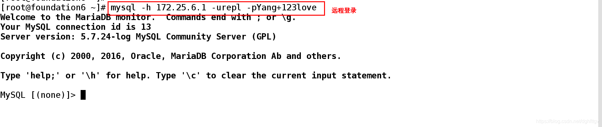 [root@foundation6 ~]# mysql -h 172.25.6.1 -urepl -pYang+123love ##可以登录成功但是看不到master数据库中的重要信息