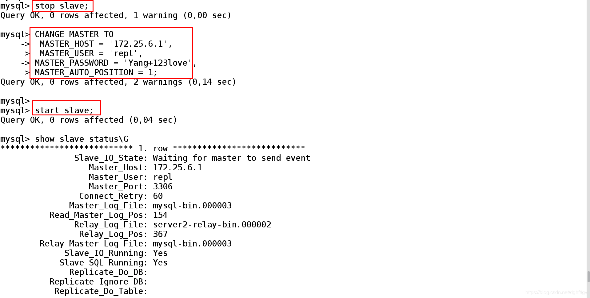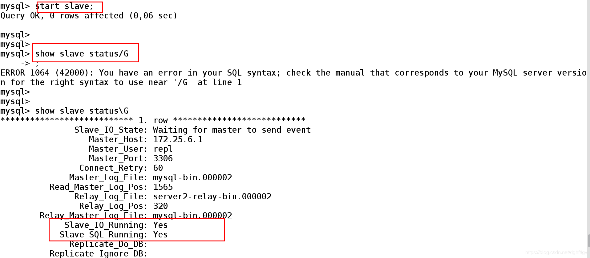 Slave_IO_Running: Yes Slave_SQL_Running: Yes 这两个参数是Yes,表示成功。