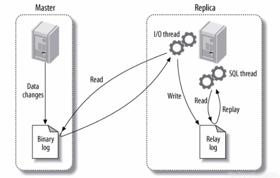 MySQL主从复制涉及到3个线程,一个运行在主节点(log dump thread),其余两个(I/O thread,SQL thread)运行在从节点,