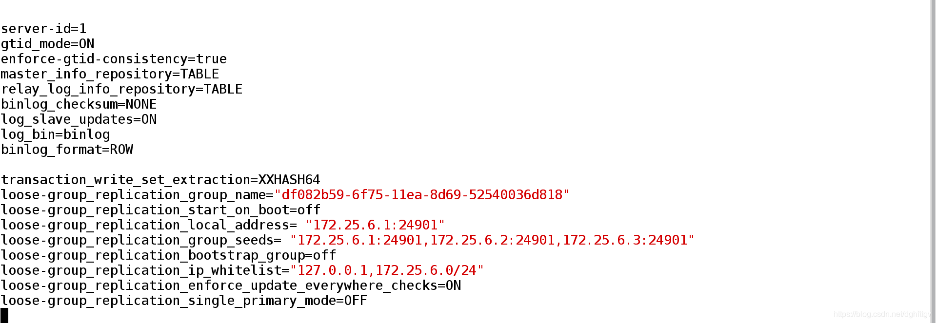 loose-group_replication_local_address= "172.25.6.1:24901 ##本机的ip
