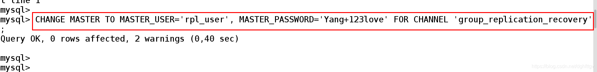 mysql> CHANGE MASTER TO MASTER_USER='rpl_user', MASTER_PASSWORD='Westos+007' FOR CHANNEL 'group_replication_recovery';