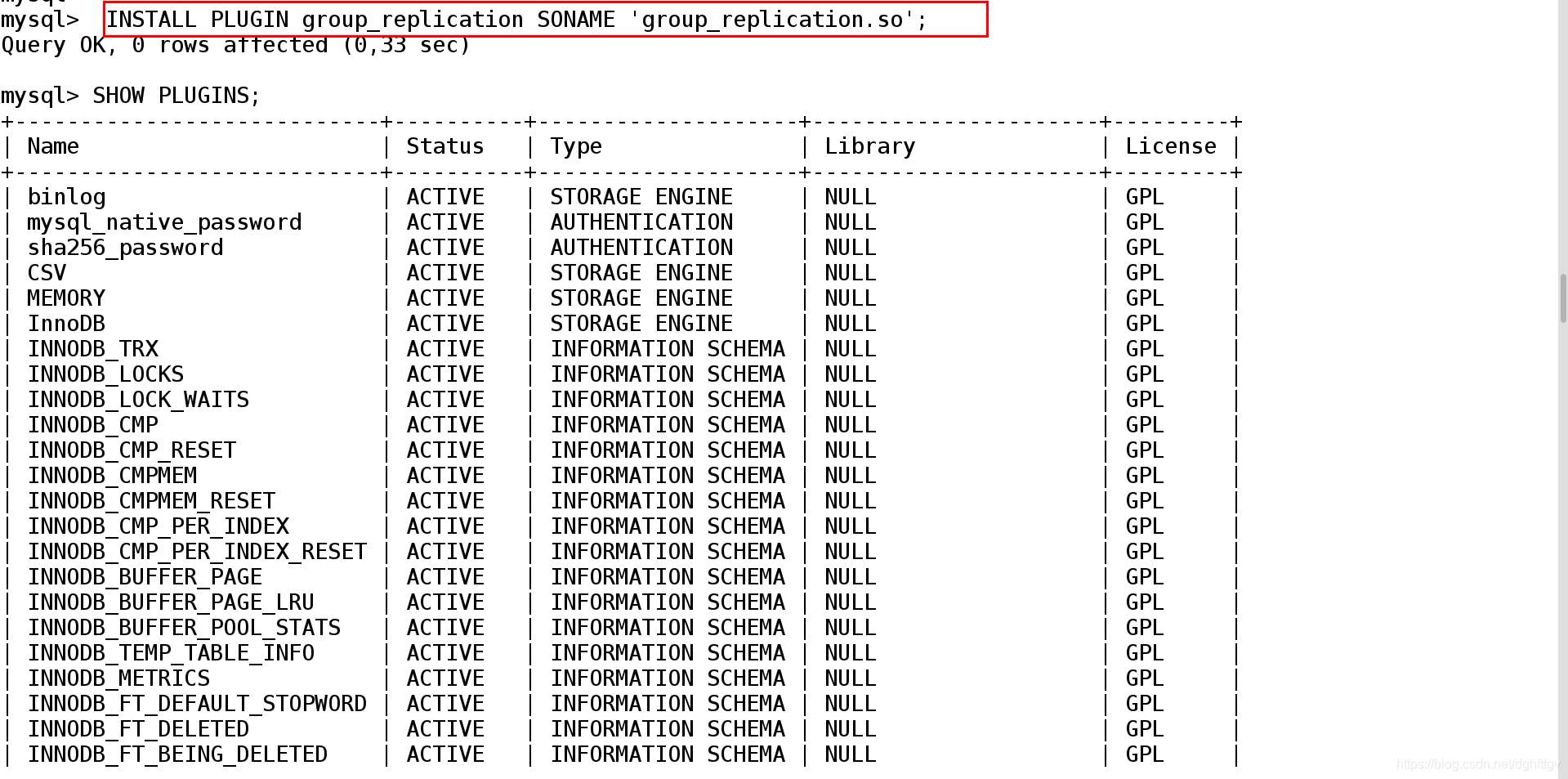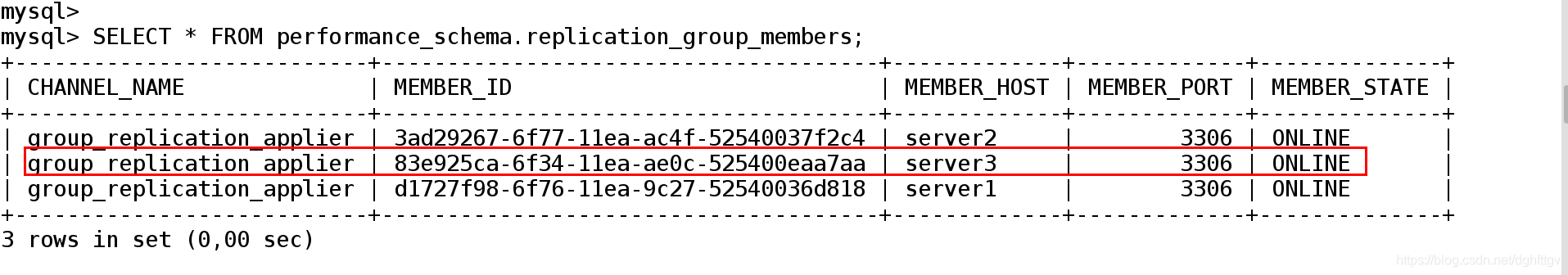 mysql> START GROUP_REPLICATION;# 查看组信息,所有节点的online