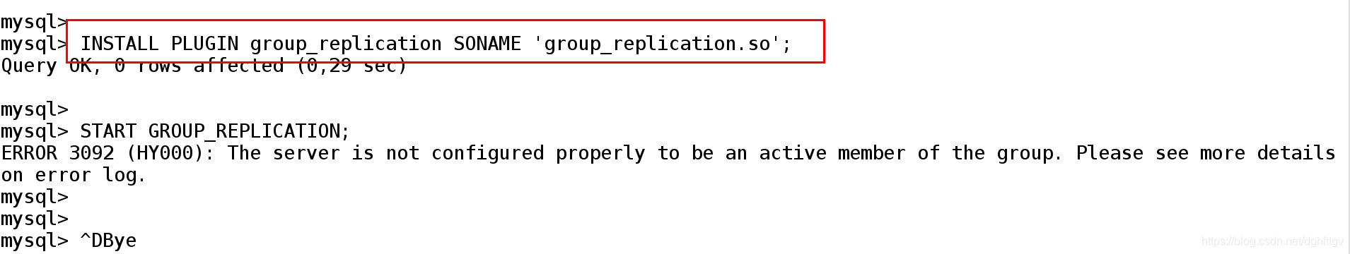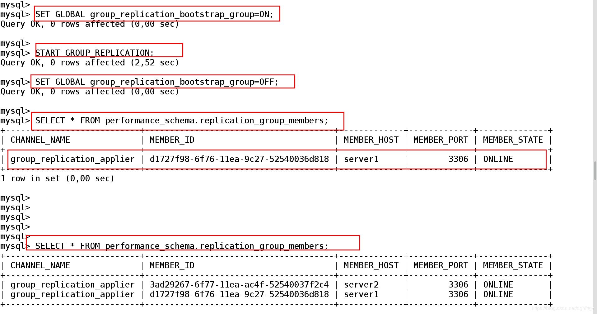 mysql> SET GLOBAL group_replication_bootstrap_group=OFF;# 其他节点执行