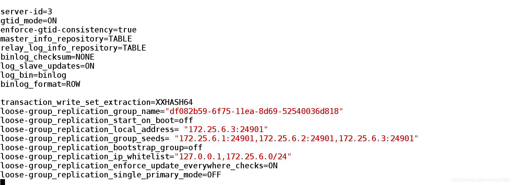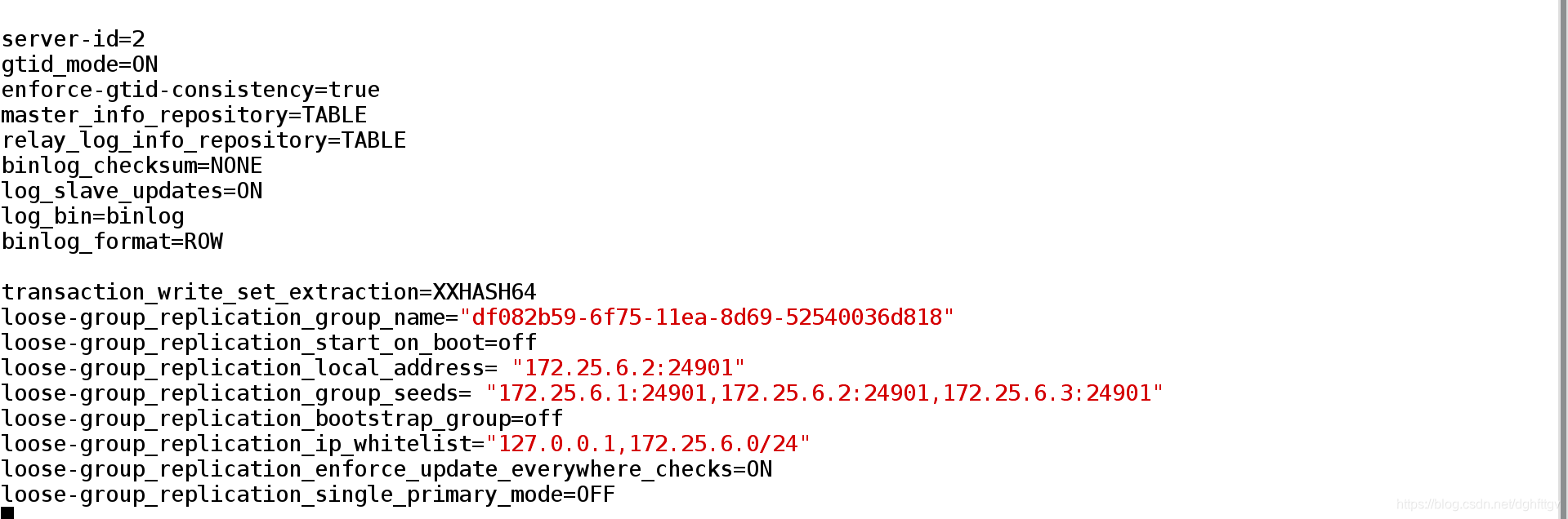 loose-group_replication_group_name="df082b59-6f75-11ea-8d69-52540036d818" ##与server1的uuid一致