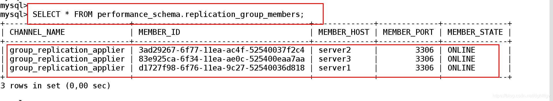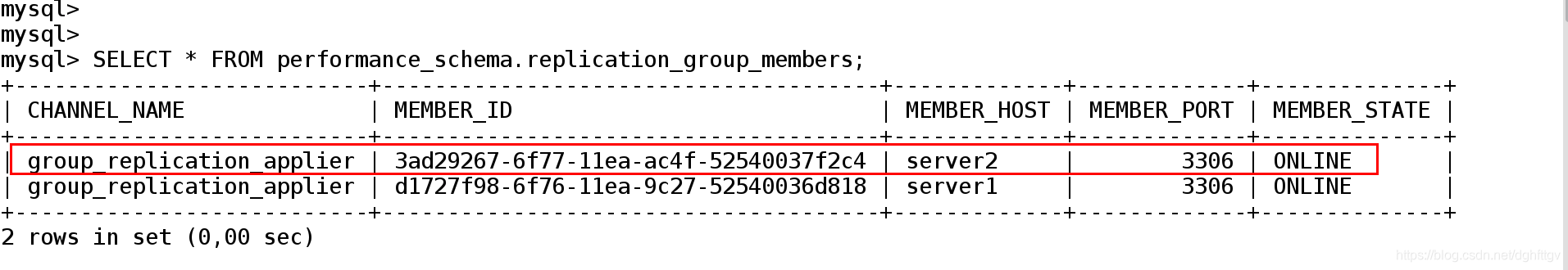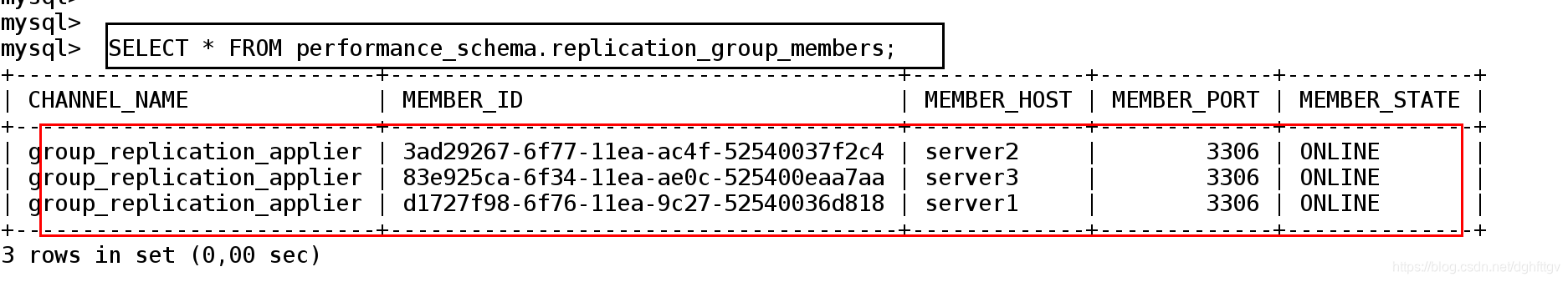 mysql> SELECT * FROM performance_schema.replication_group_members;