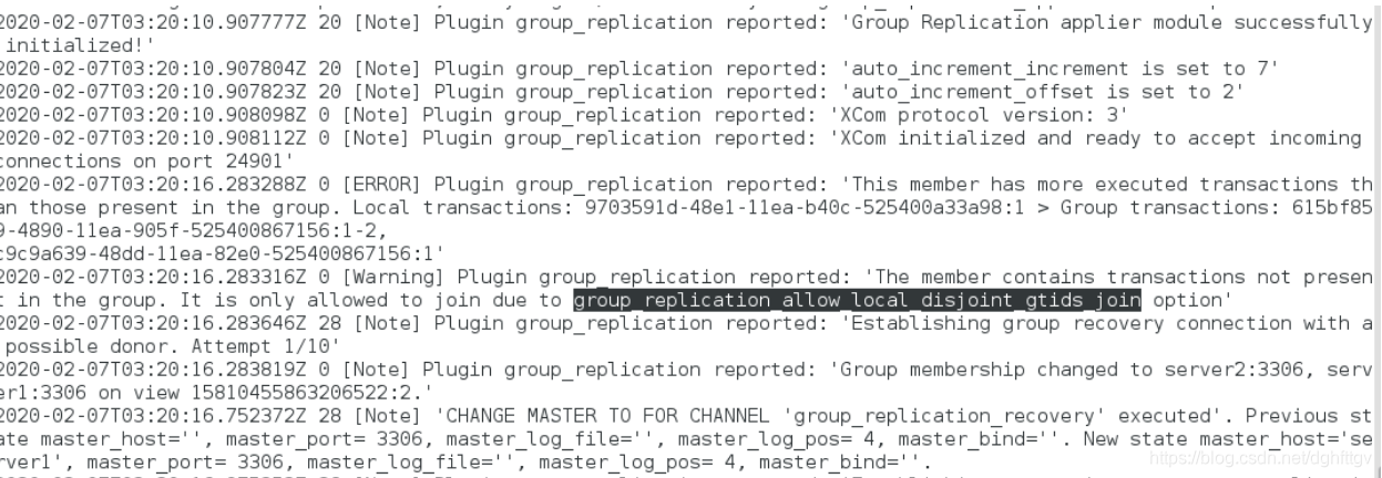 3、日志中提示要开启变量group_replication_allow_local_disjoint_gtids_join