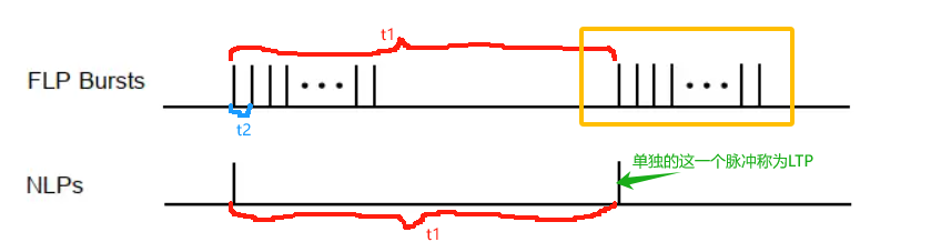 (3)FLP(fast link pulse):即快速链路脉冲,将一整簇间隔62.5us ± 7 us(t2)且簇之间间隔等同于NLP间隔的脉冲簇成为FLP