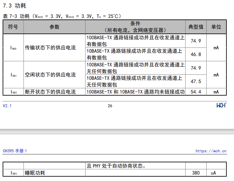 7,21: 原CH395L的3.3v电源输入,需接0.1uf对地电容; 现CH395P的3.3v电源输入,需接0.1uF并联10uF或4.7uF对地电容,贴近芯片放置。(这2个引脚对应的对地电容值改为4.7uF)
