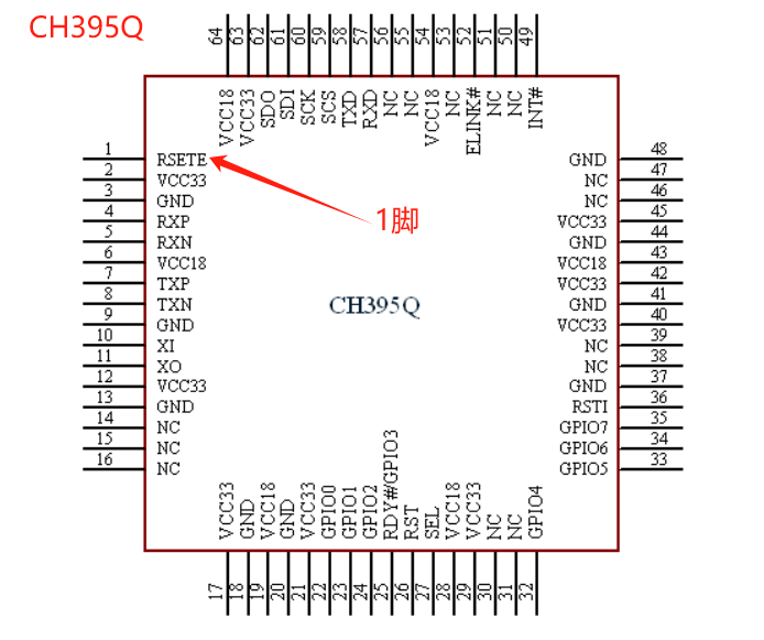 6、54、64: 原CH395Q为1.8v电源输入; 现CH395A为NC脚 (去掉1.8V的LDO,这三个脚对应的对地电容不焊接)