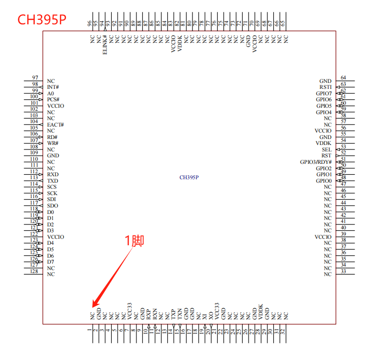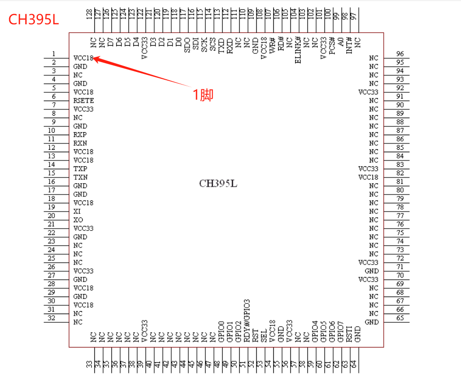 1,5,12,13,18,30,108: 原CH395L为1.8v电源输入; 现CH395P为NC脚 (去掉1.8V的LDO,对应的对地电容不焊接)