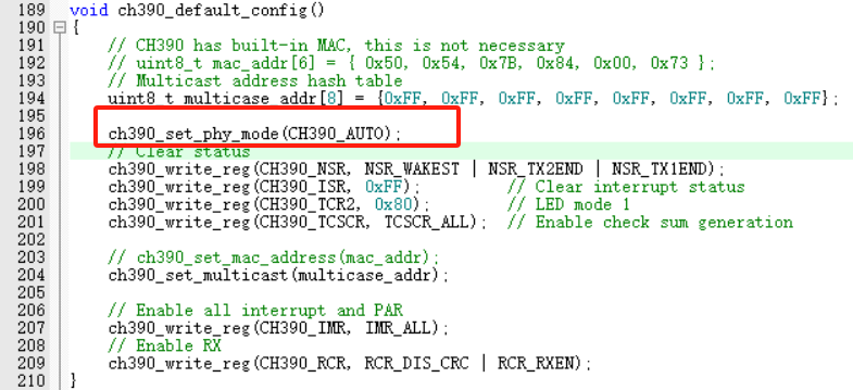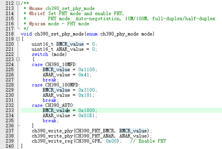 首先,例程中的main主函数里,在 ch390_default_config();函数中有对PHY的工作模式配,默认都是配置为自协商模式